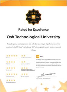 По результатам независимой оценки по методологии QS Stars™ Ошский технологический университет получил рейтинг 4 звезды — Rated for Excellence. Оценка проводится путём строгого и независимого сбора данных и анализа показателей эффективности.