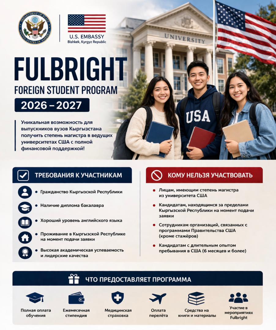 Государственный департамент США и Посольство США в Кыргызской Республике объявляют конкурс на участие в программе Fulbright Foreign Student Program!